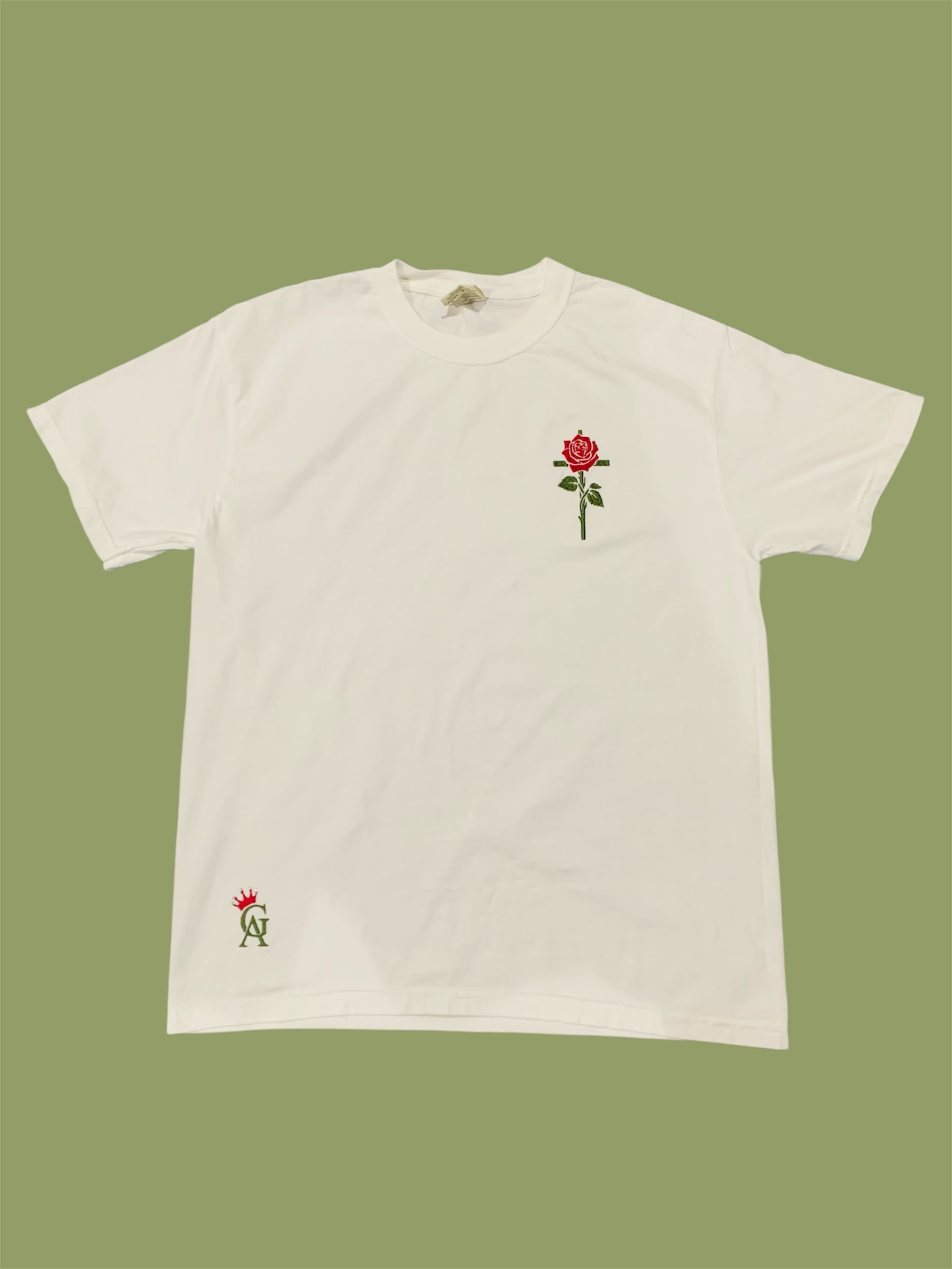 Camisa de algodon Unisex para adulto. Bordada con el diseño de una rosa sobre una cruz, bordada con colores vibrantes rojo y verde. Su tela suave y su diseño minimalista la hacen perfecta para llevar tu Fe puesta todos los días.