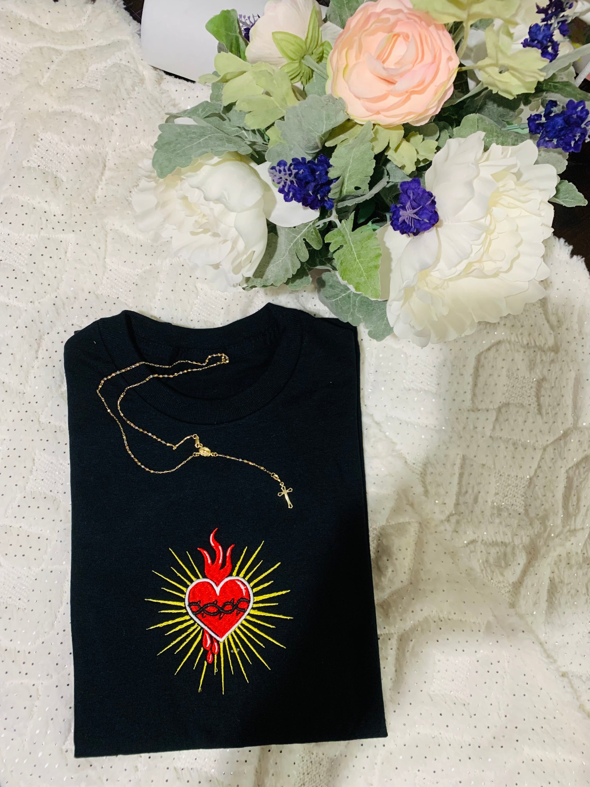 Camisa Unisex de algodon, bordada con El Sagrado Corazón de Jesús, su diseño está lleno de significado espiritual. El Sagrado corazón resalta en el pecho con tonos vivos en rojo, dorado y negro, recordandote que la Fe siempre te acompaña.
