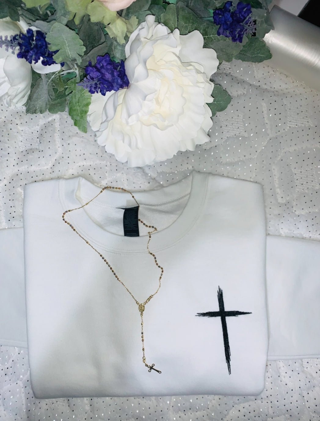 Sudadera Unisex de cuello redondo, confeccionda en algodon suave. Su diseño destaca una cruz bordada en el pecho que resalta al istante. Un detalle elegante que eleva el estilo clasico. Facil de combinar. Ideal para cualquier ocasión.