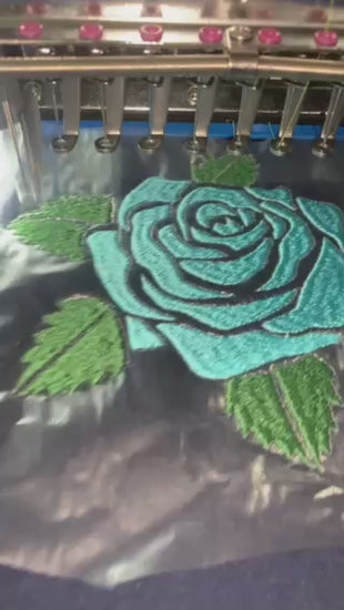 Handmade embroidered Rose design onto Unisex cotton Hoodie. The embroidered Rose design and hat are surrounded by rhinestones.